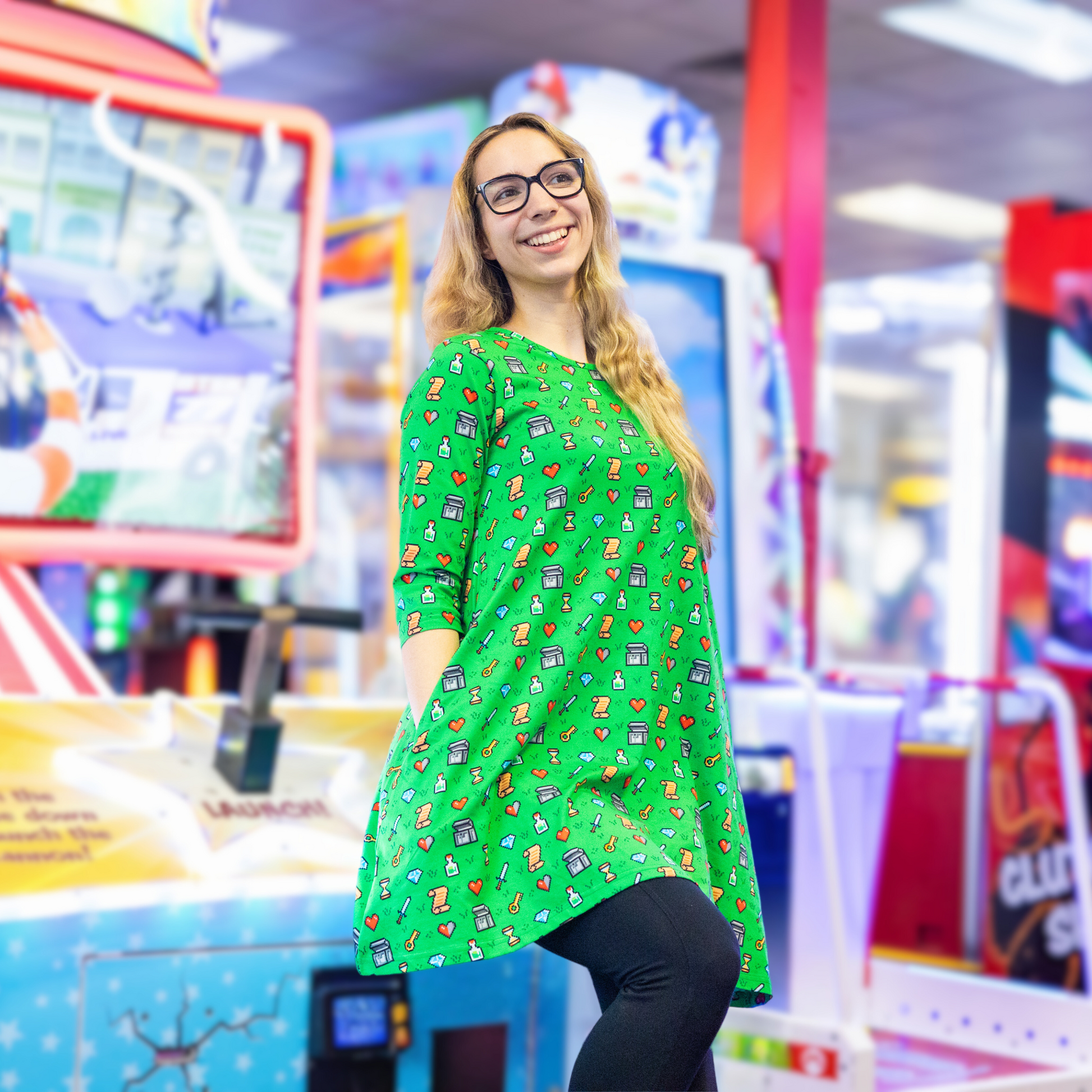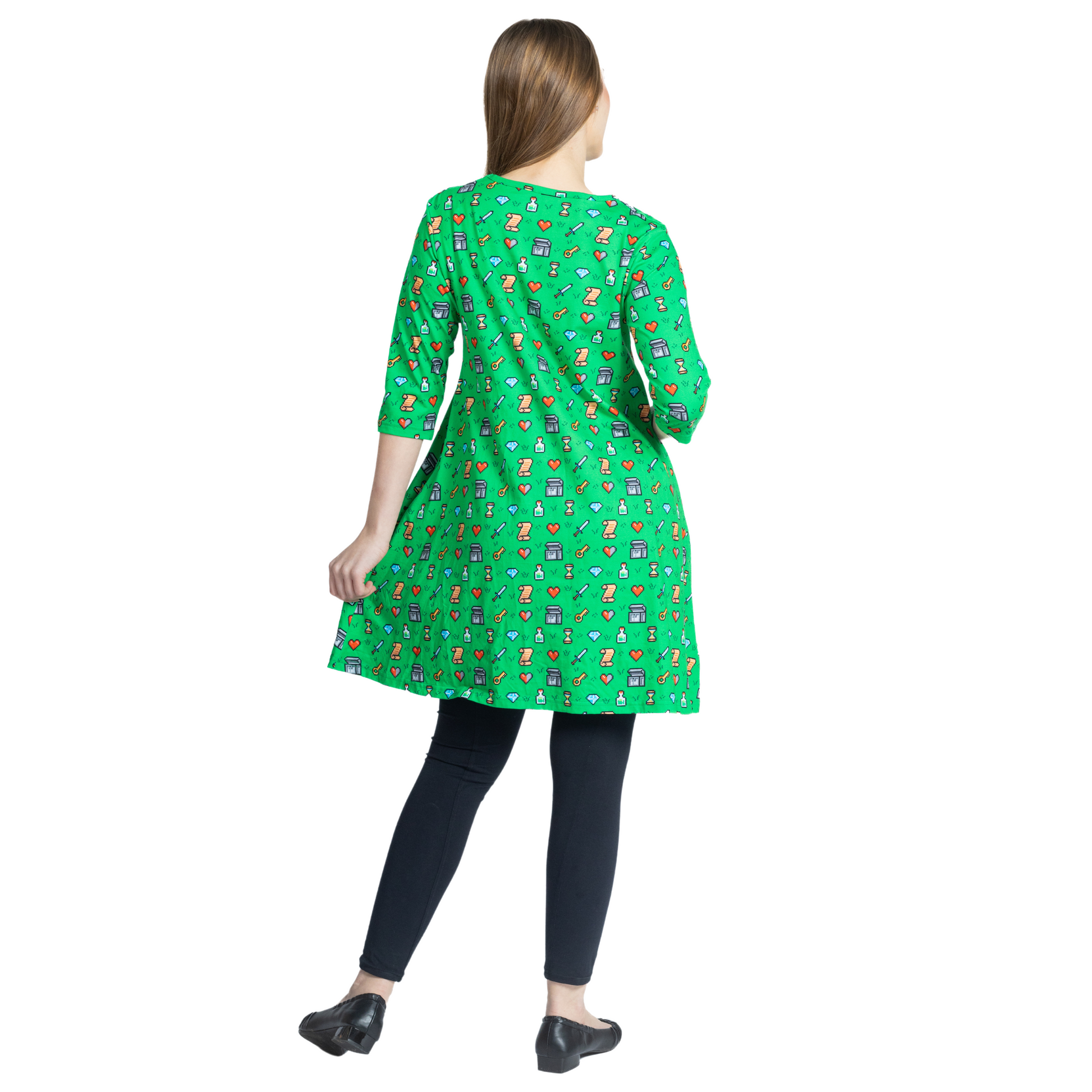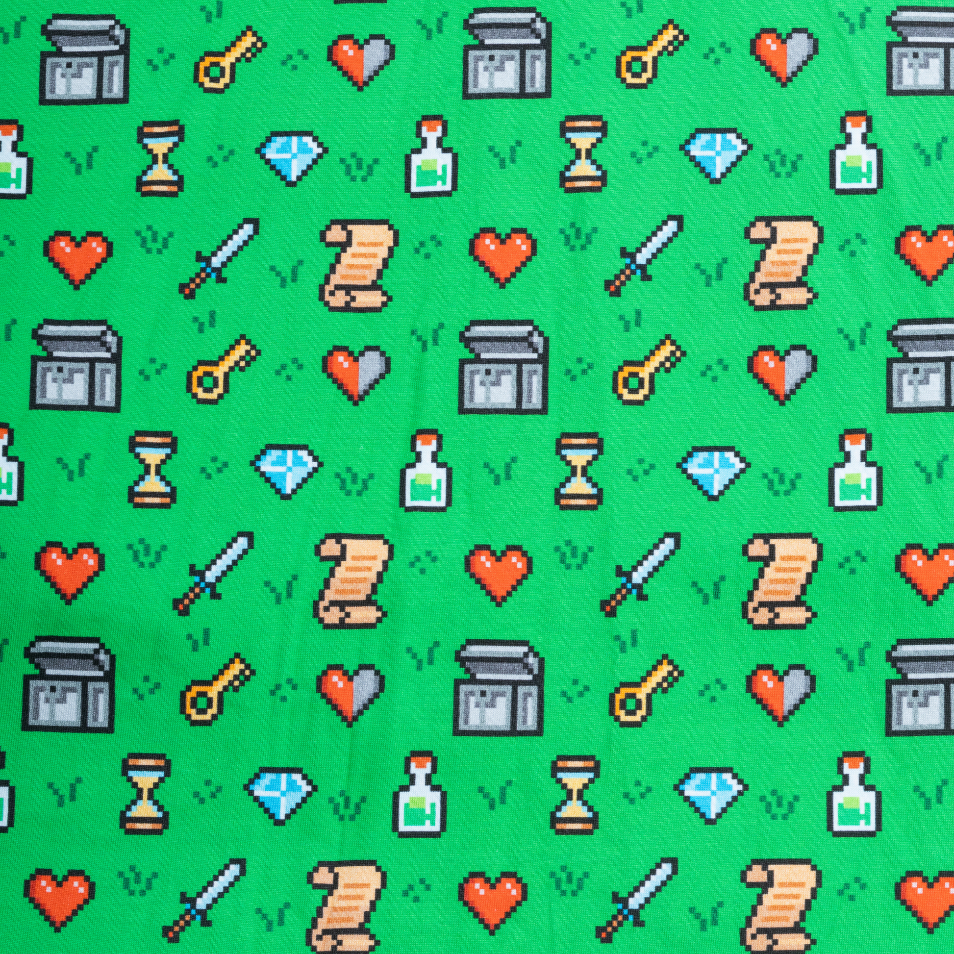 Embark on a fashion quest with our nostalgic 8-Bit Adventure print! Inspired by classic retro games, this design is a pixel-perfect tribute to epic adventures, heroic journeys, and legendary style. Featuring iconic 8-bit motifs—treasure chests, swords, hearts, and magical landscapes—this print is a wearable love letter to gaming’s golden age. The vibrant pixel art pops against a bold green backdrop, creating a look that's as adventurous as the games that inspired it.