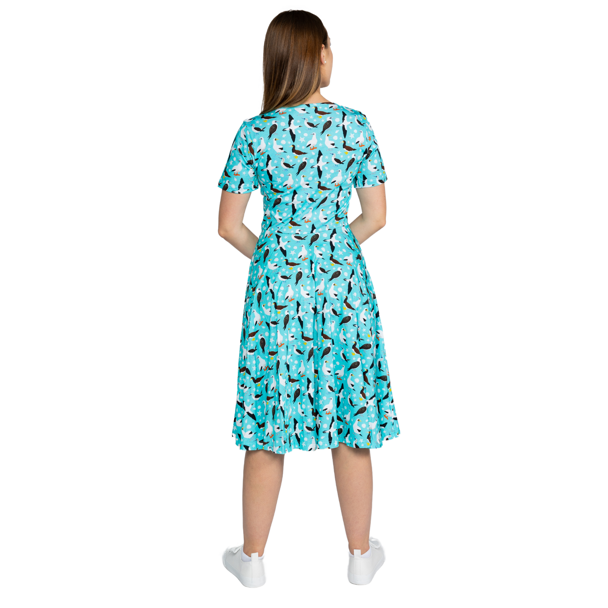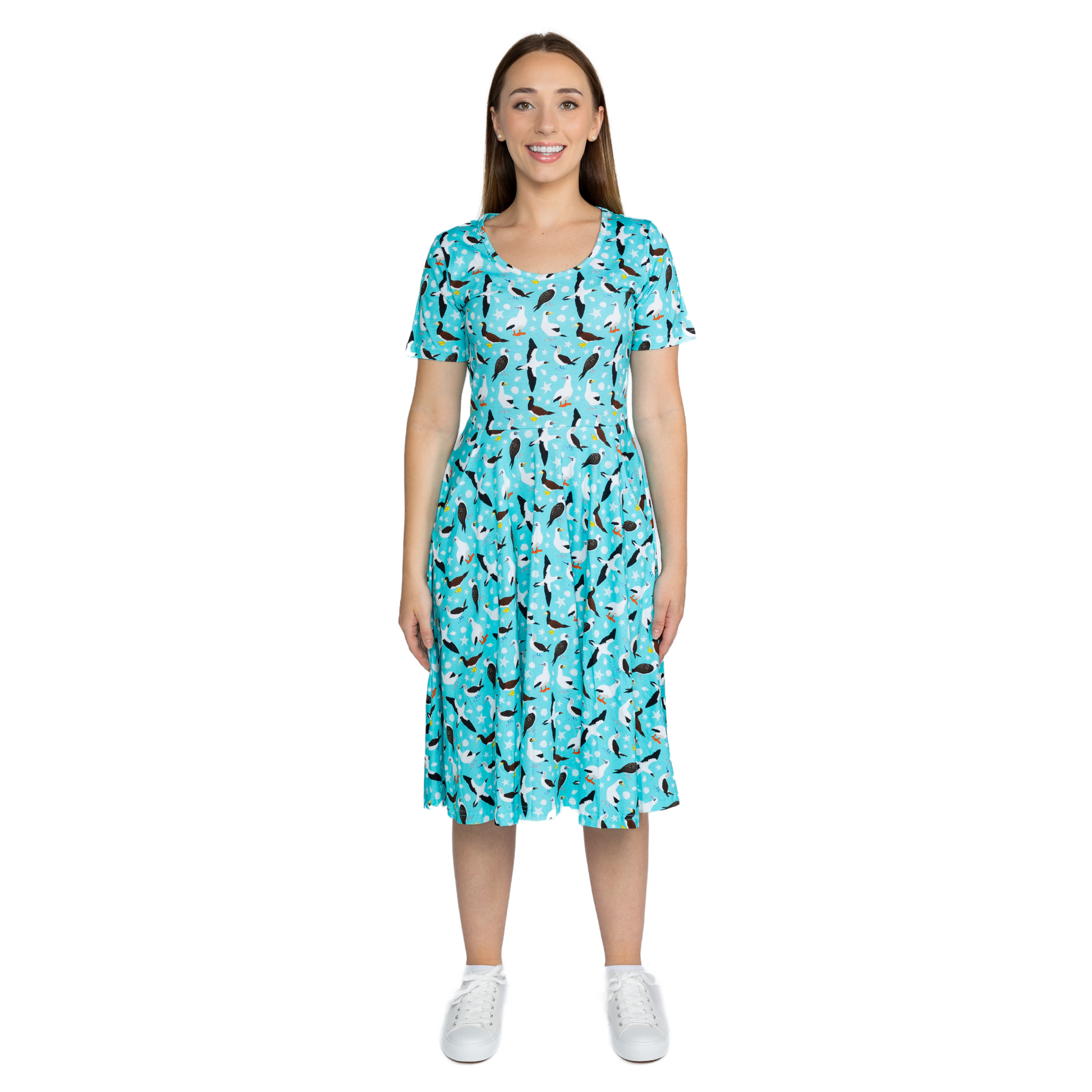 - Short-sleeve, scoop-neck, 3/4th circle twirl adult dress with pockets