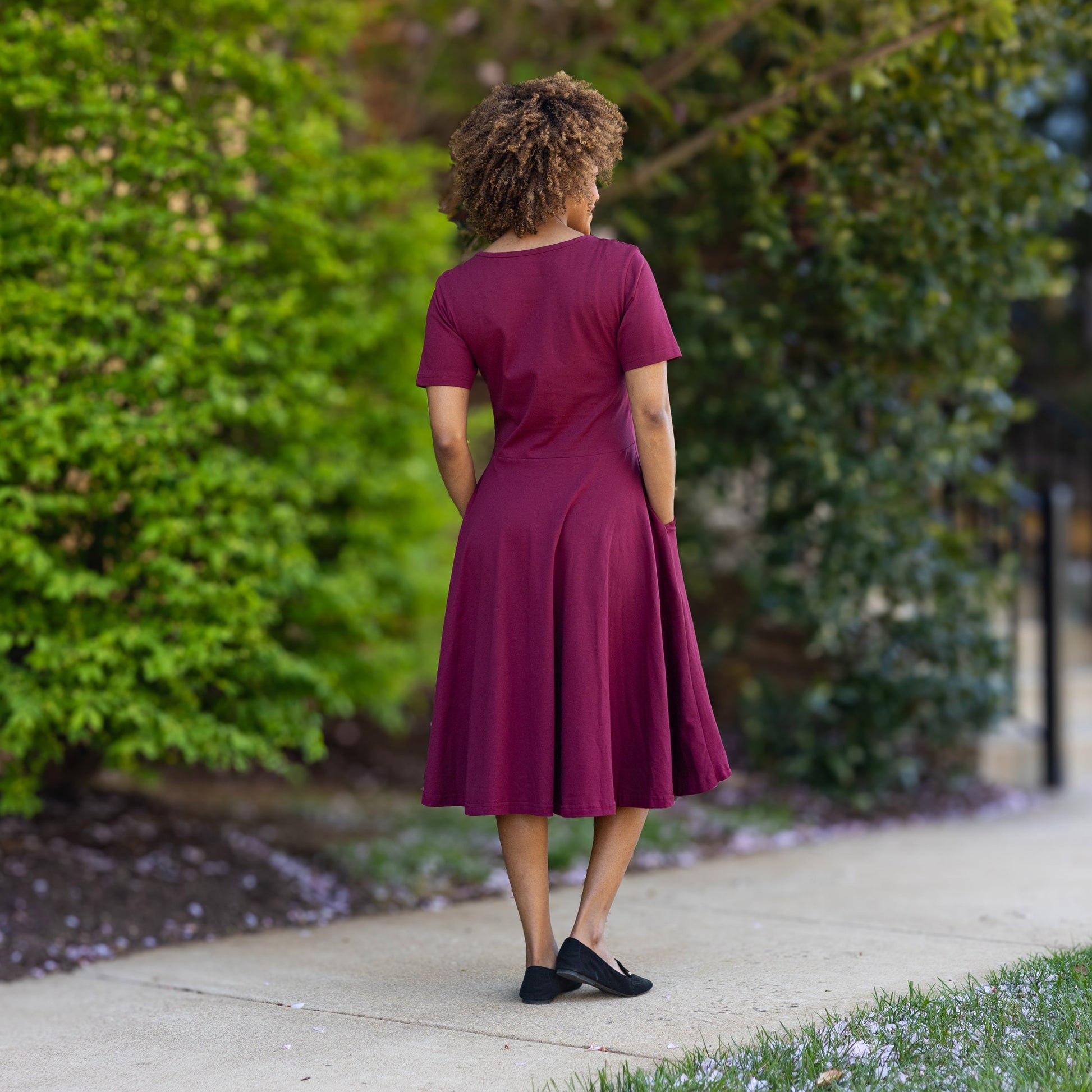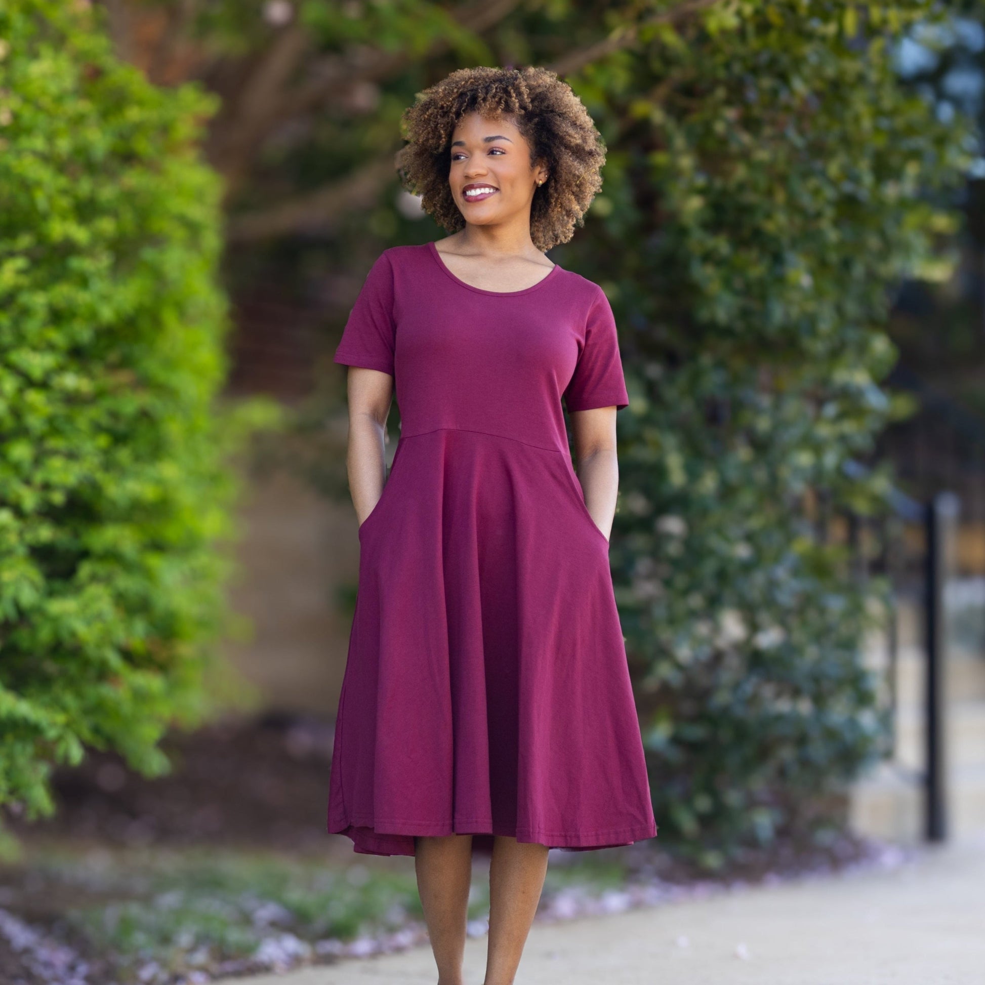 - Short sleeves, scoop neck, 3/4th circle twirl adult dress with pockets