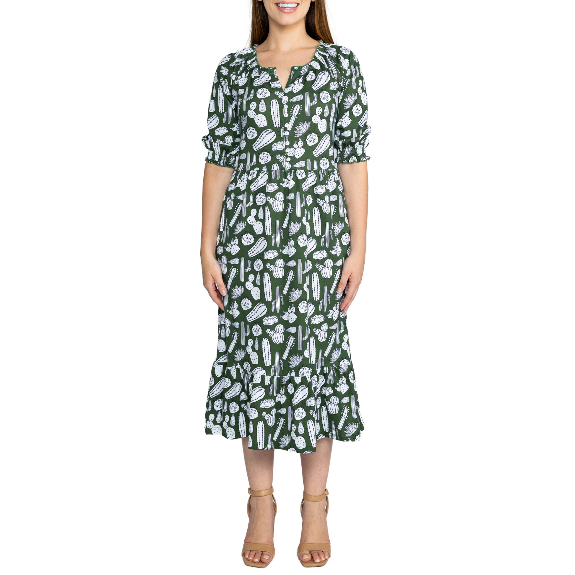 Cactus Plants Elastic Puff-Sleeved Tiered Midi Dress