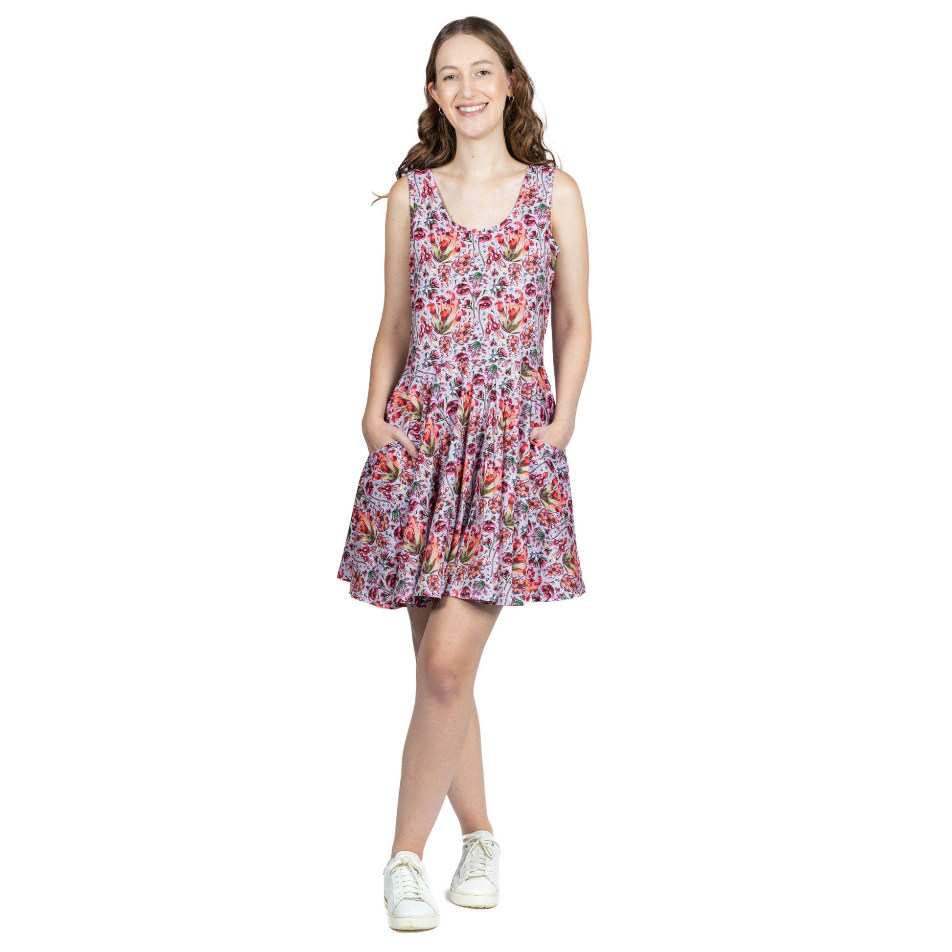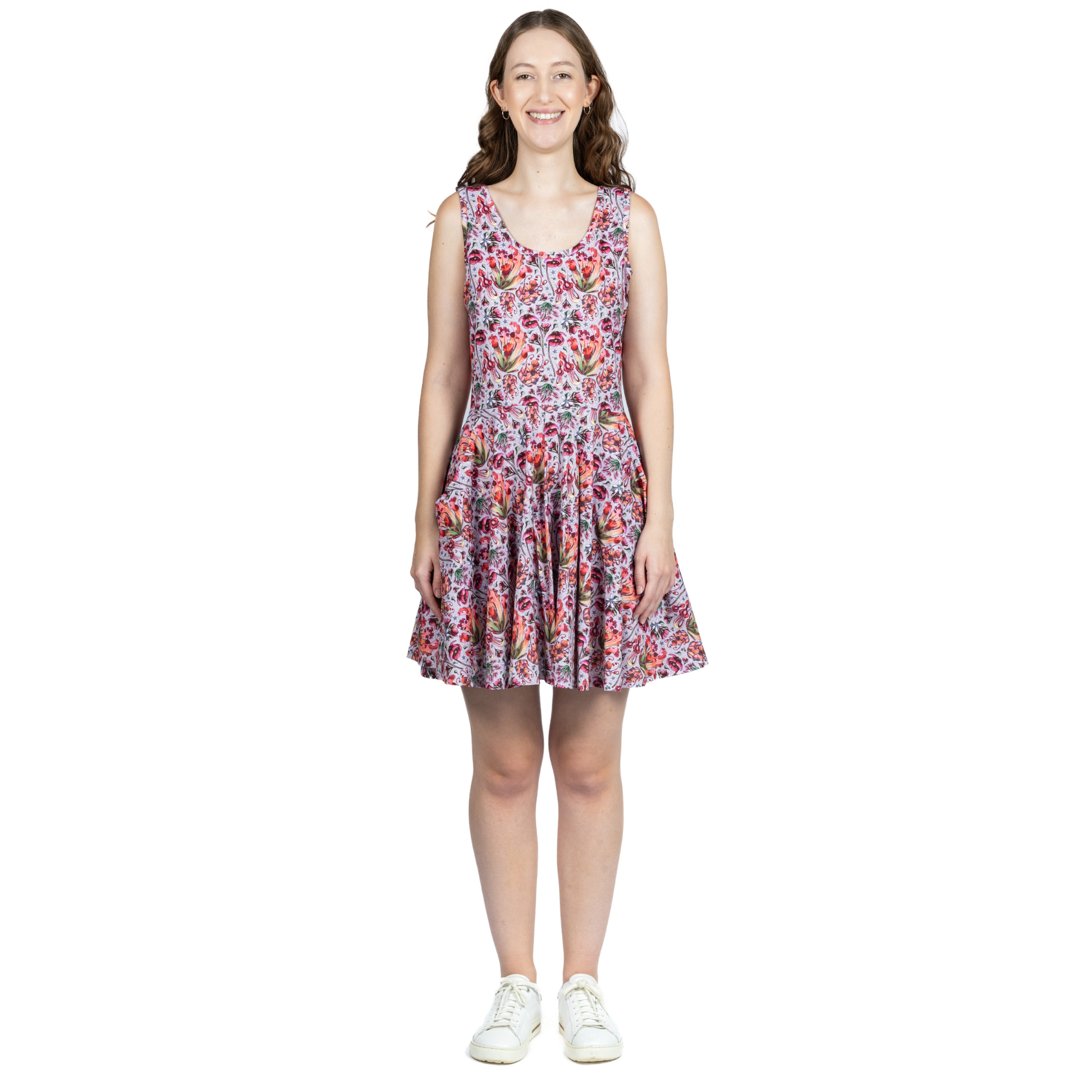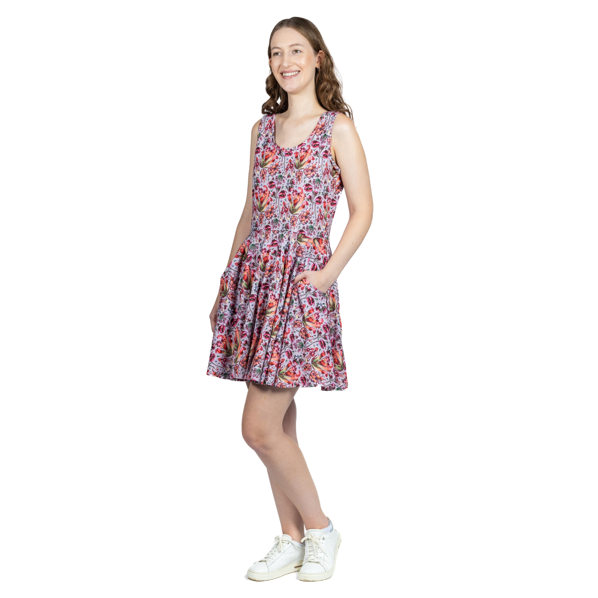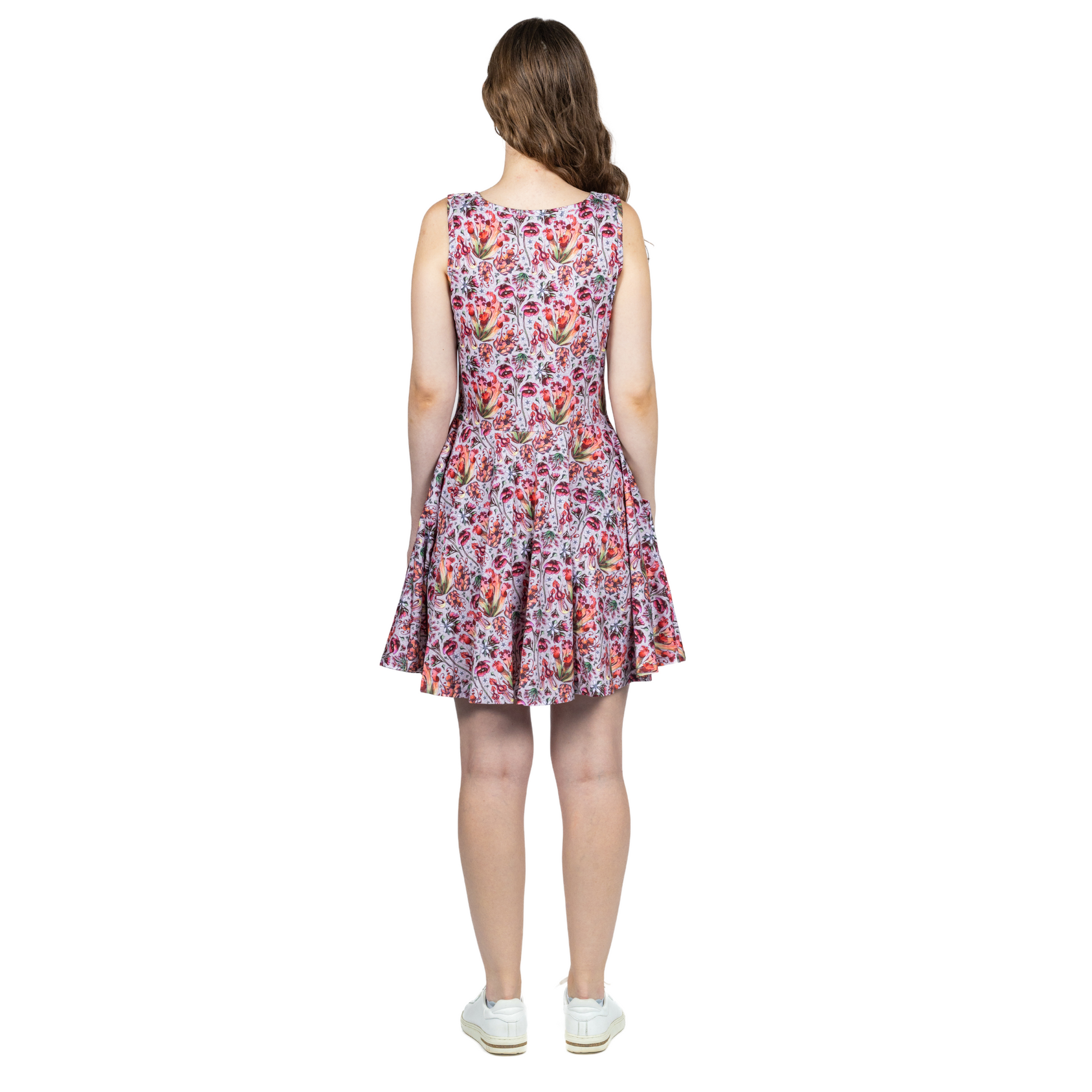 - Sleeveless, scoop neck, adult skater dress with pockets