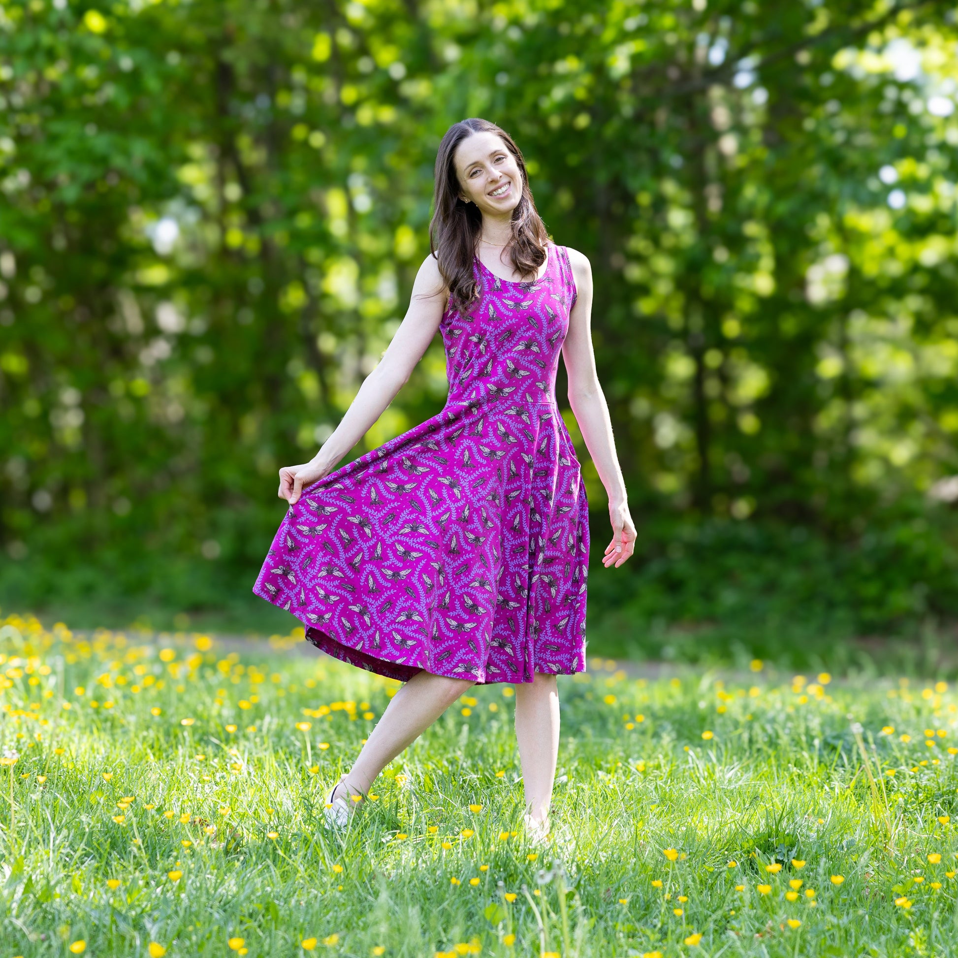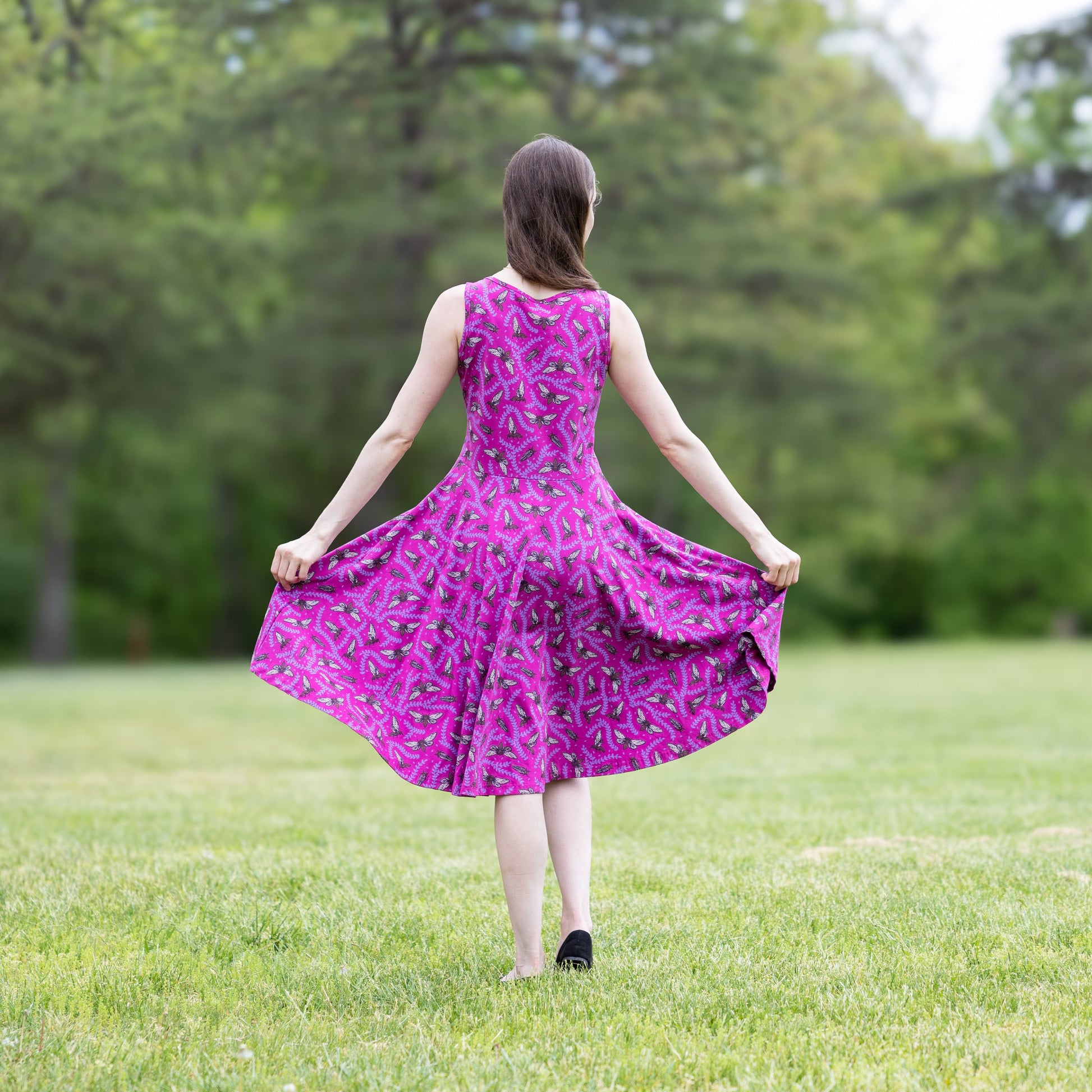 - Sleeveless, adult dress with pockets, and 3/4th circle skirt