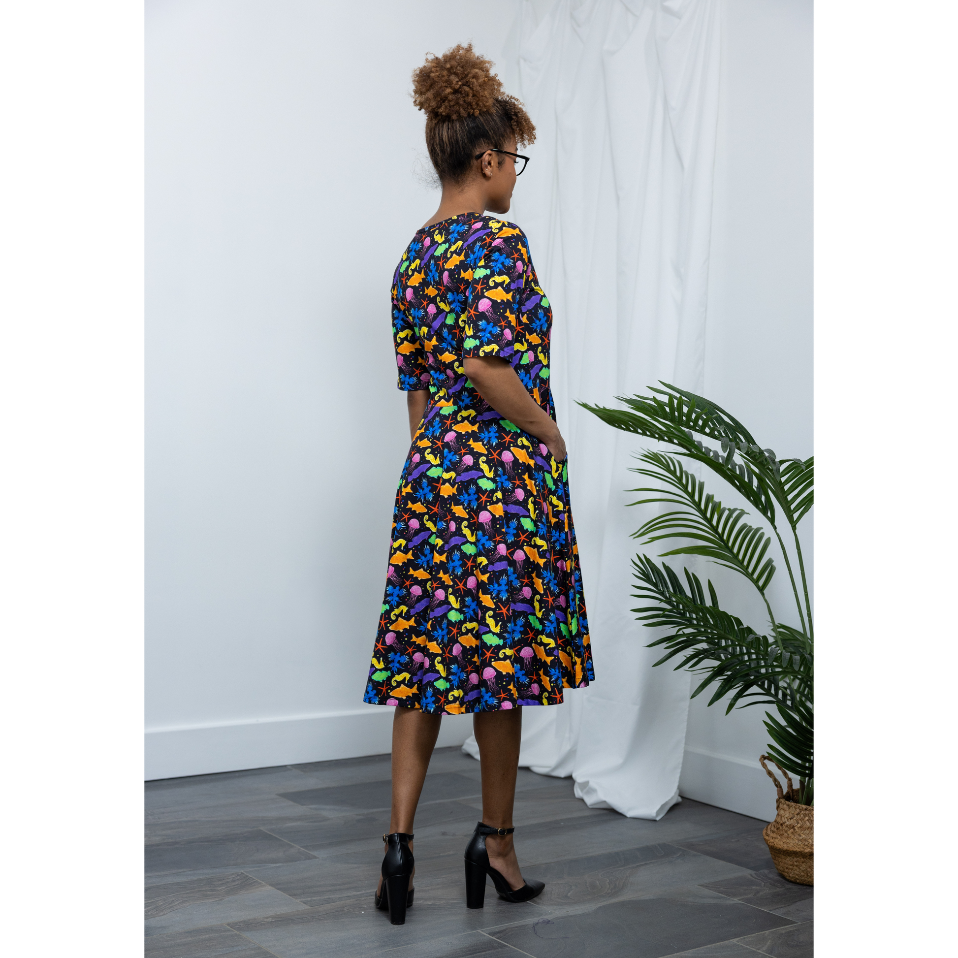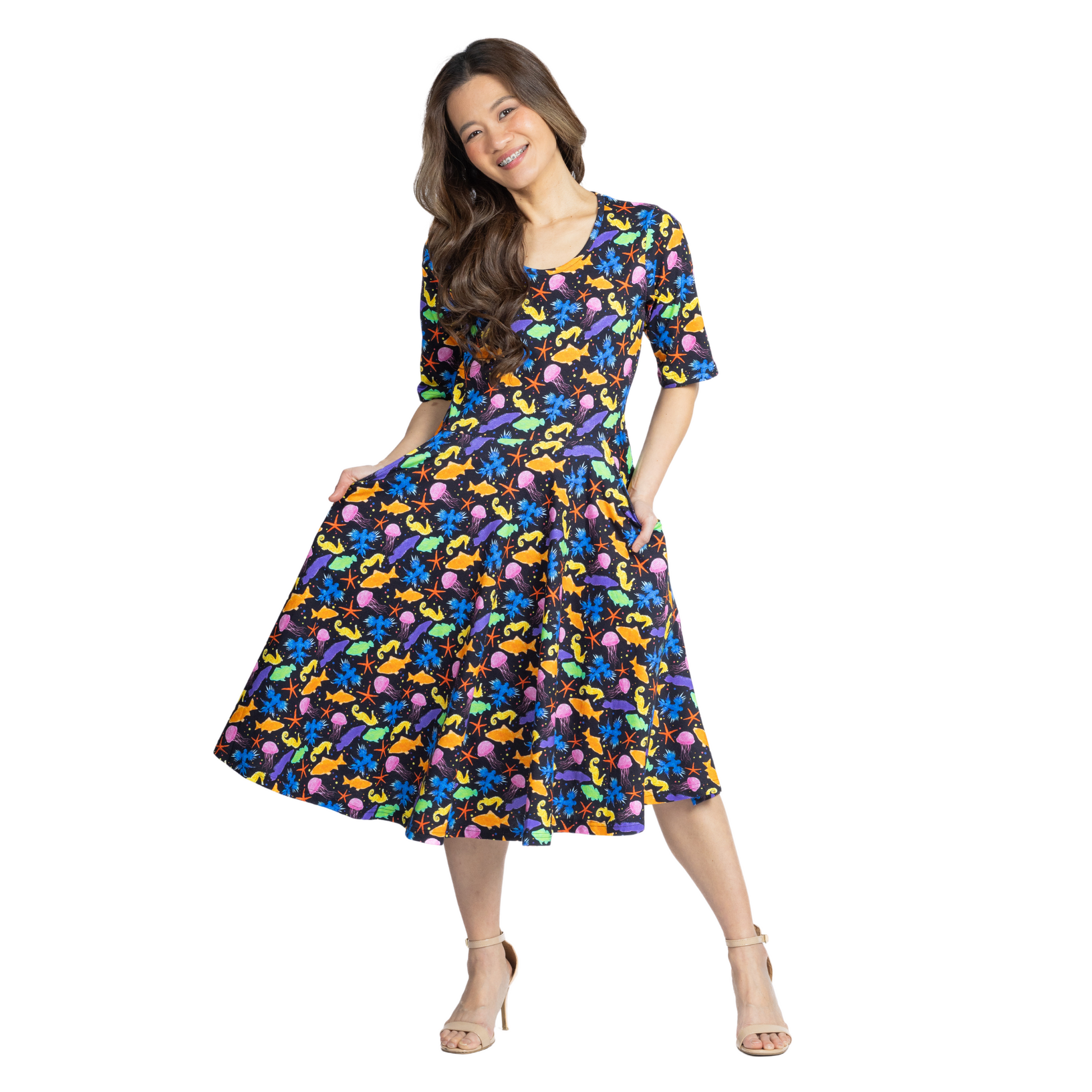 This design features a lively array of sea creatures, from pink jellyfish and majestic blue glaucus to goldfish and elegant jellyfish, all brought to life in a sea of brilliant colors. Seas the day and be the star of the conversation with this dress!