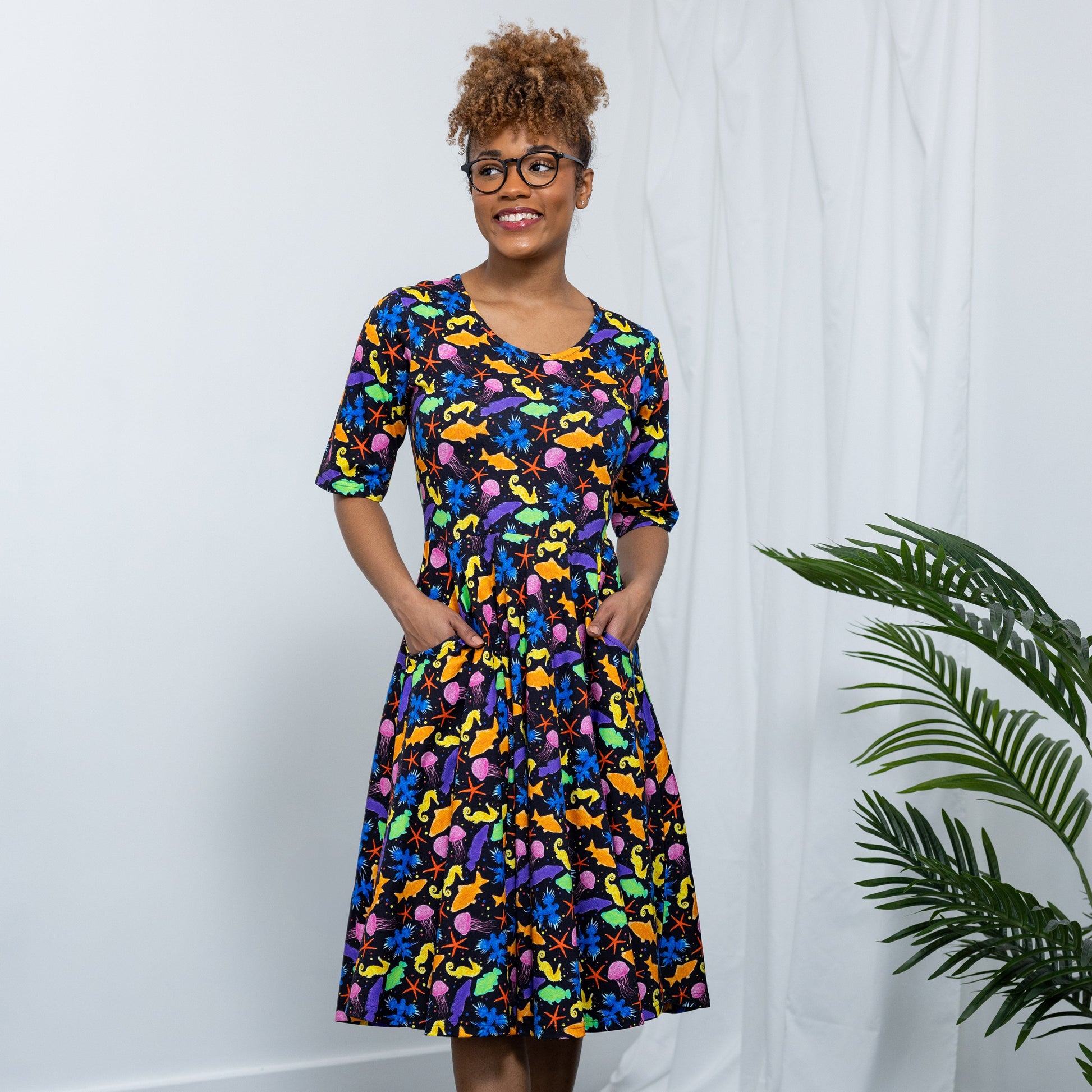 - Elbow sleeves, scoop neck 3/4th circle twirl adult dress with pockets