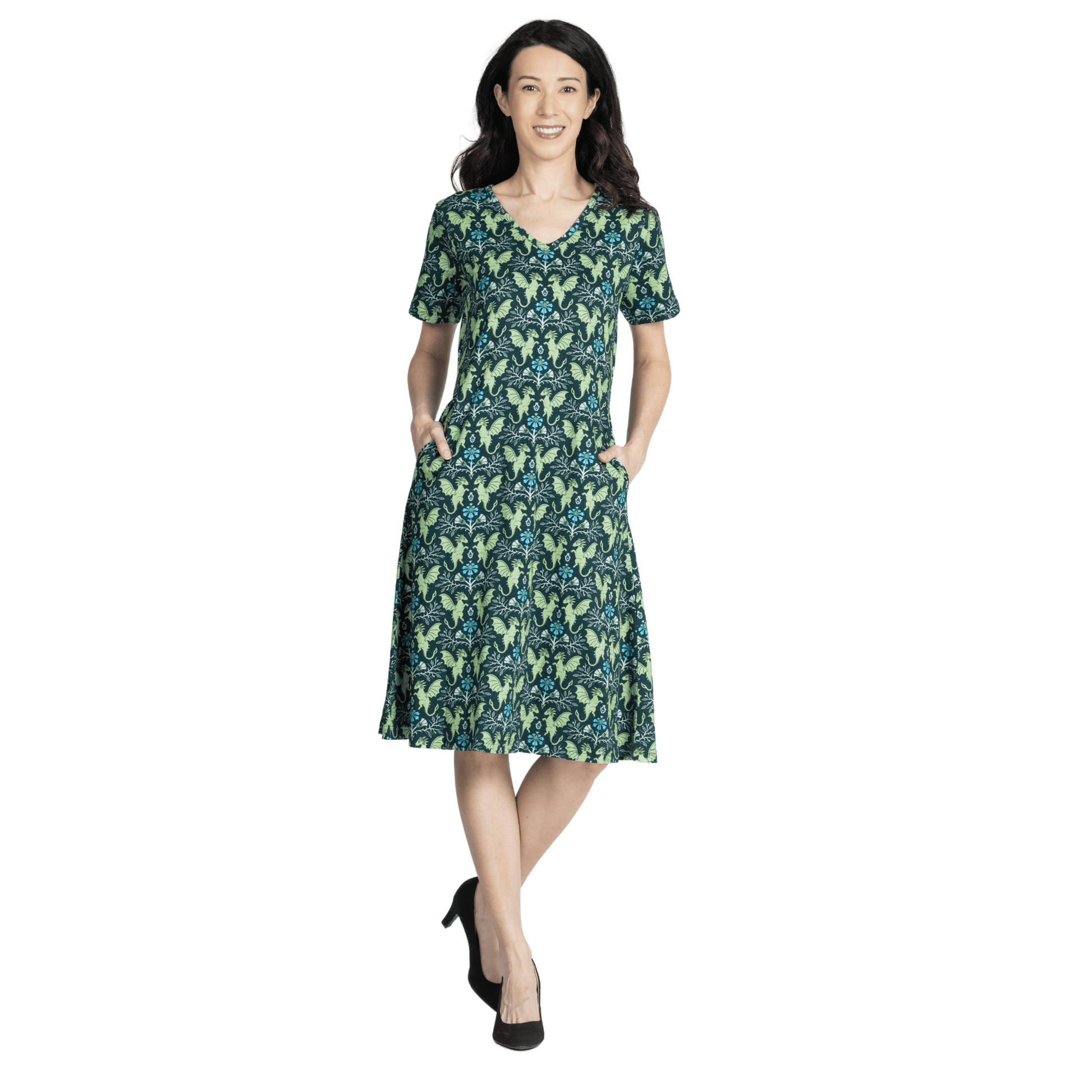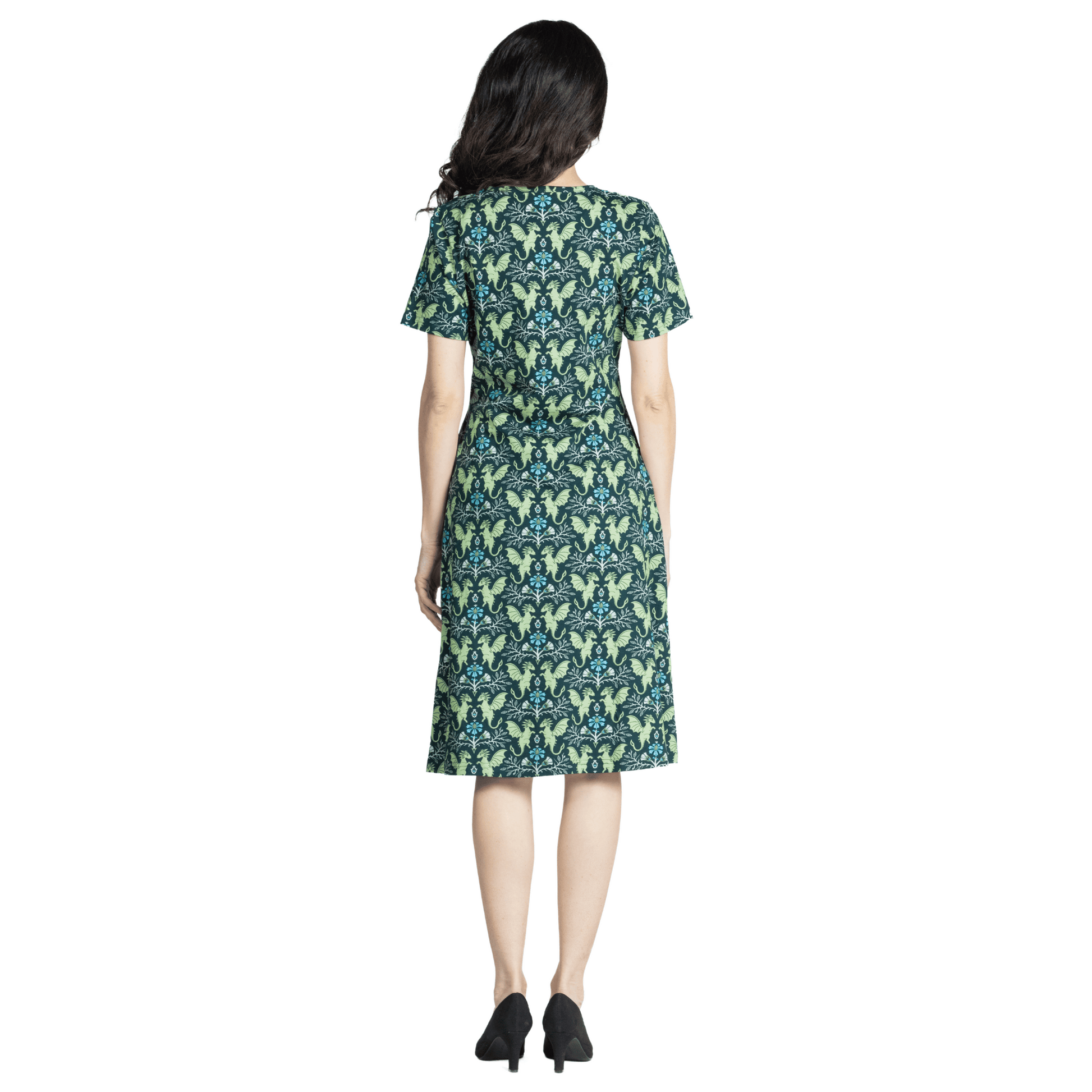 Crafted with exquisite attention to detail, this dress features a stunning damask print adorned with intricate dragon motifs, weaving a tale of power and grace with every thread. From fiery dragons soaring across the fabric to delicate damask patterns, each element is a testament to the magic of storytelling and the allure of the unknown. Embrace your inner dragon tamer and unleash your fierce yet elegant side as you glide through the day in our luxurious dress!