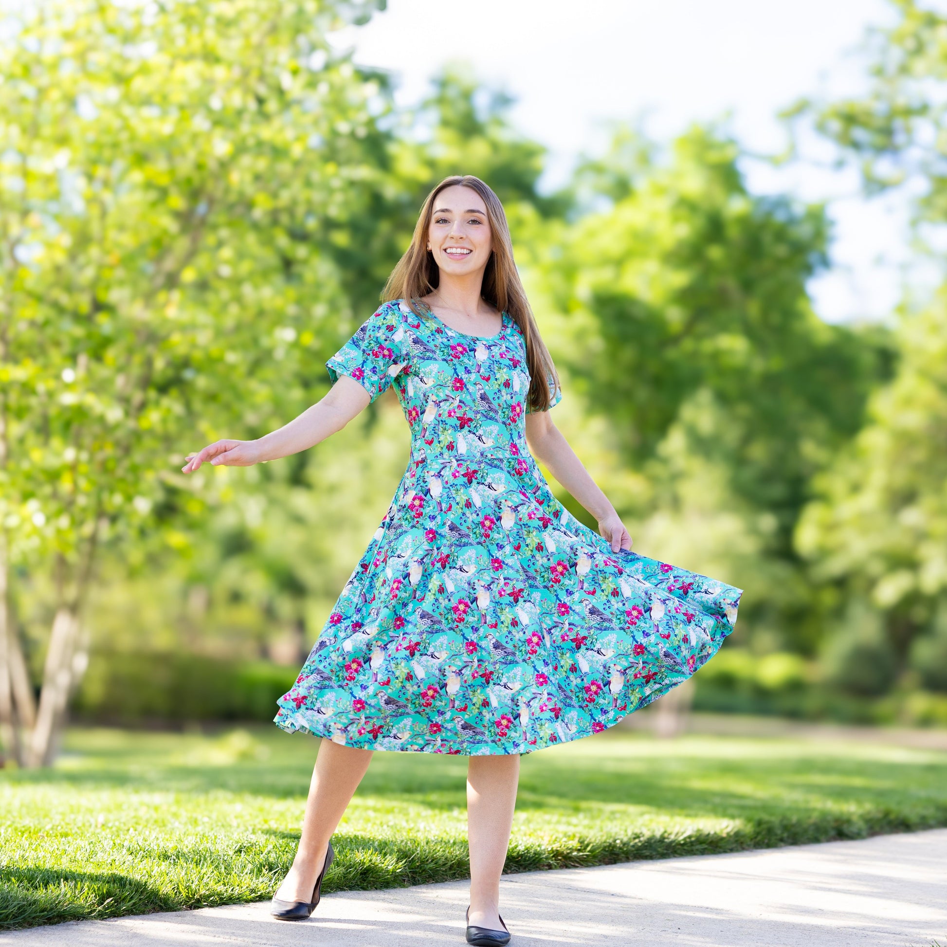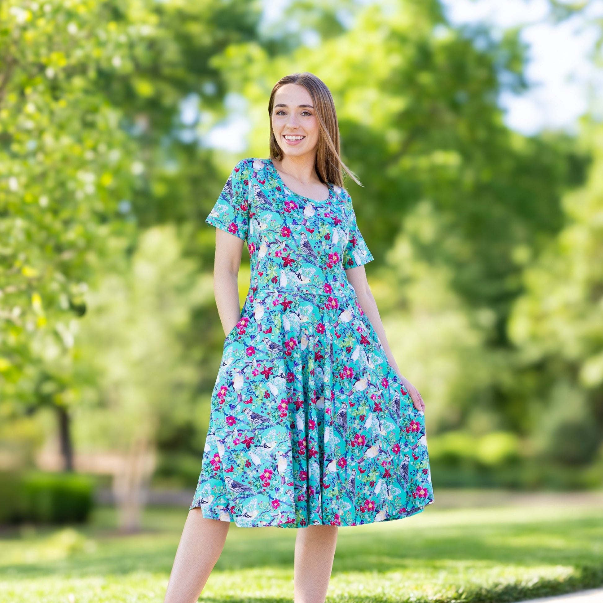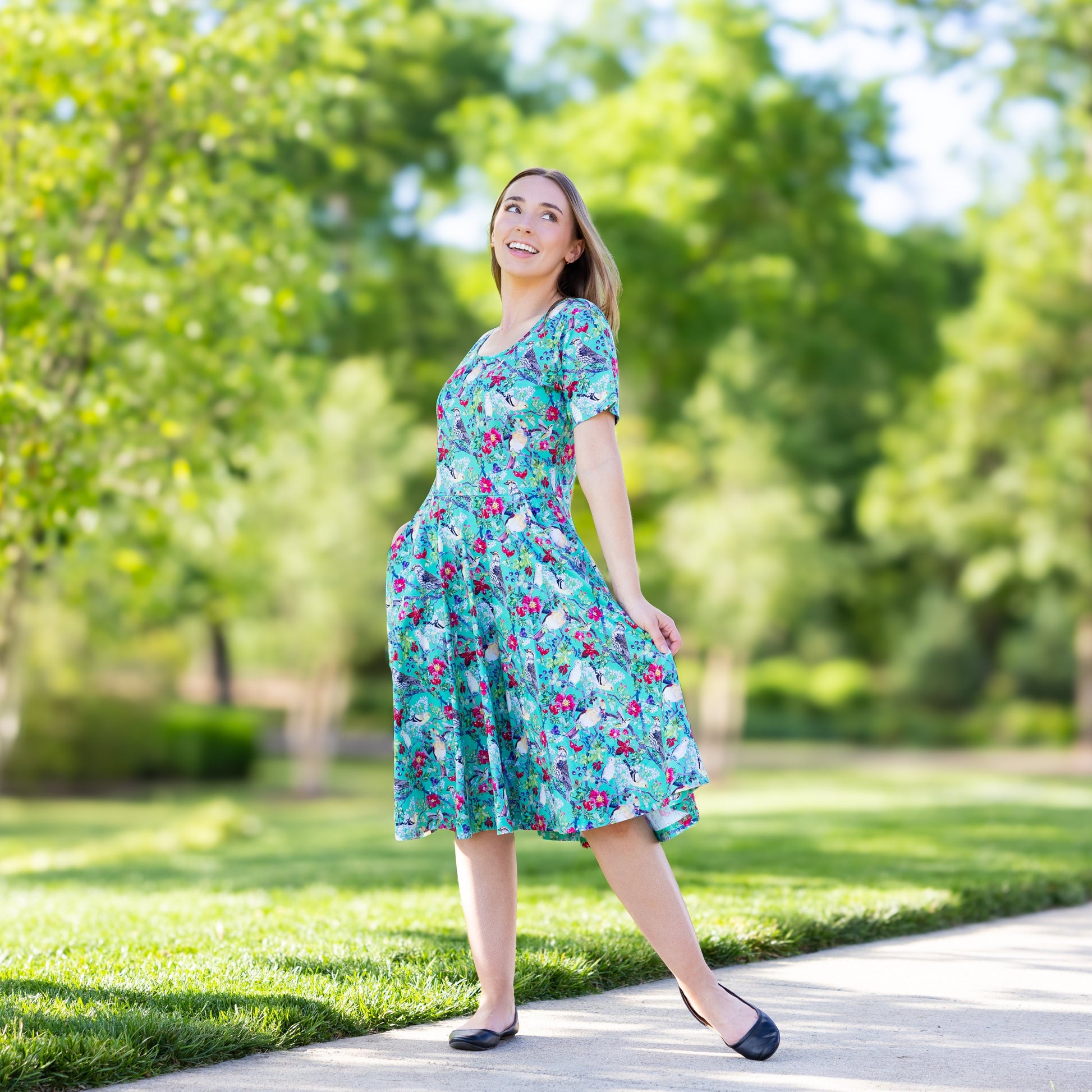 - Short Sleeves, scoop neck adult dress with pockets, and 3/4th circle skirt