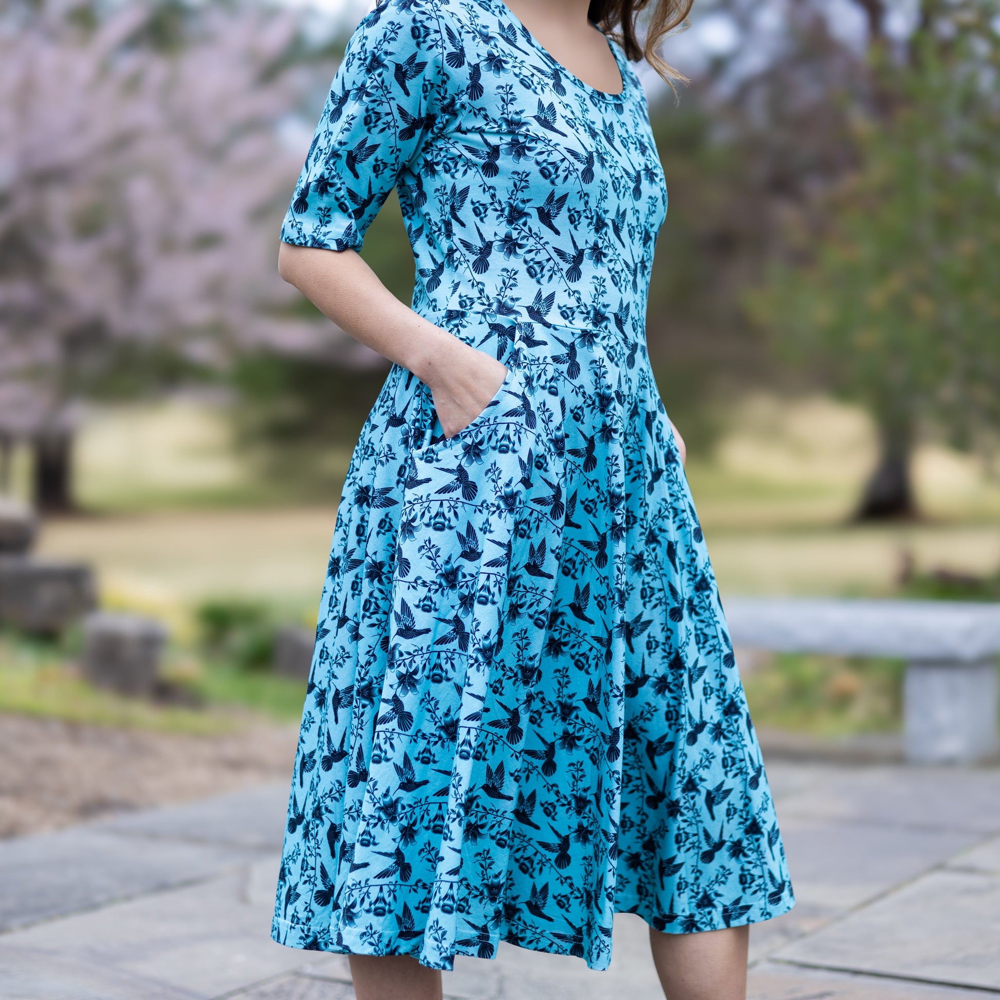 - Elbow sleeves, scoop neck 3/4th circle twirl adult dress with pockets