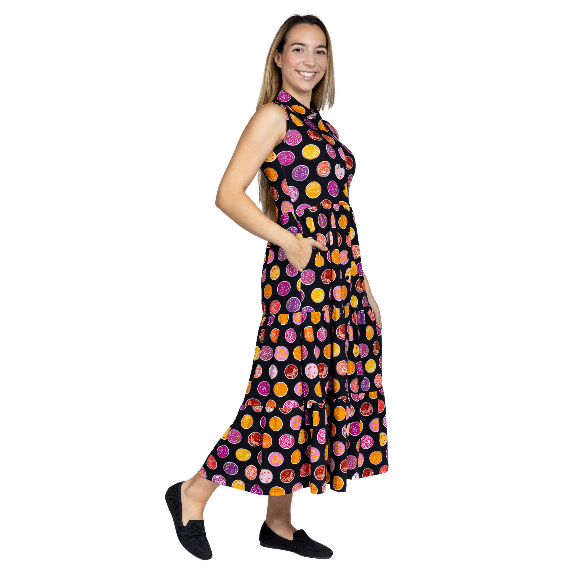 Petri Dish Button-Up Tiered Long Midi Dress (With Waist Seam)