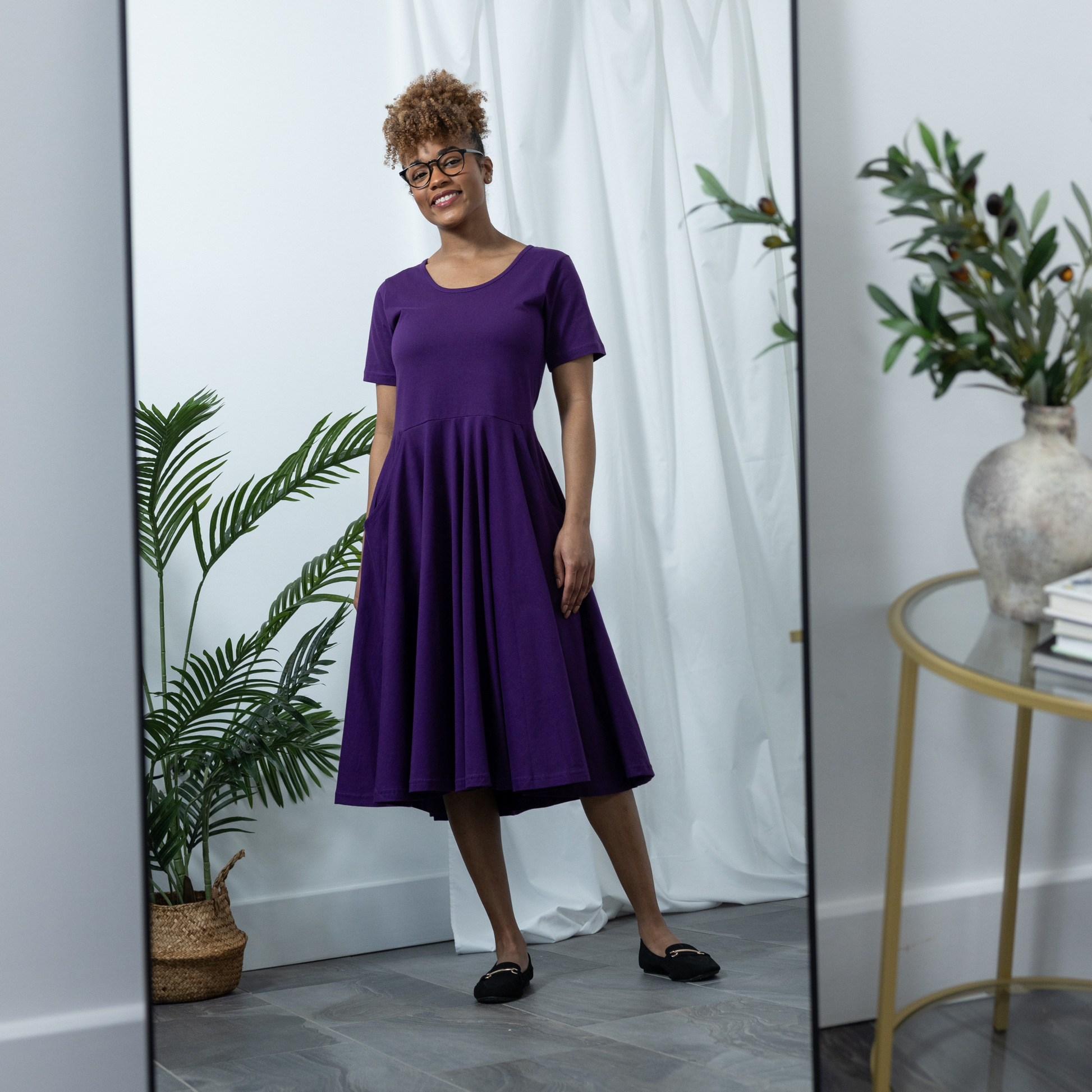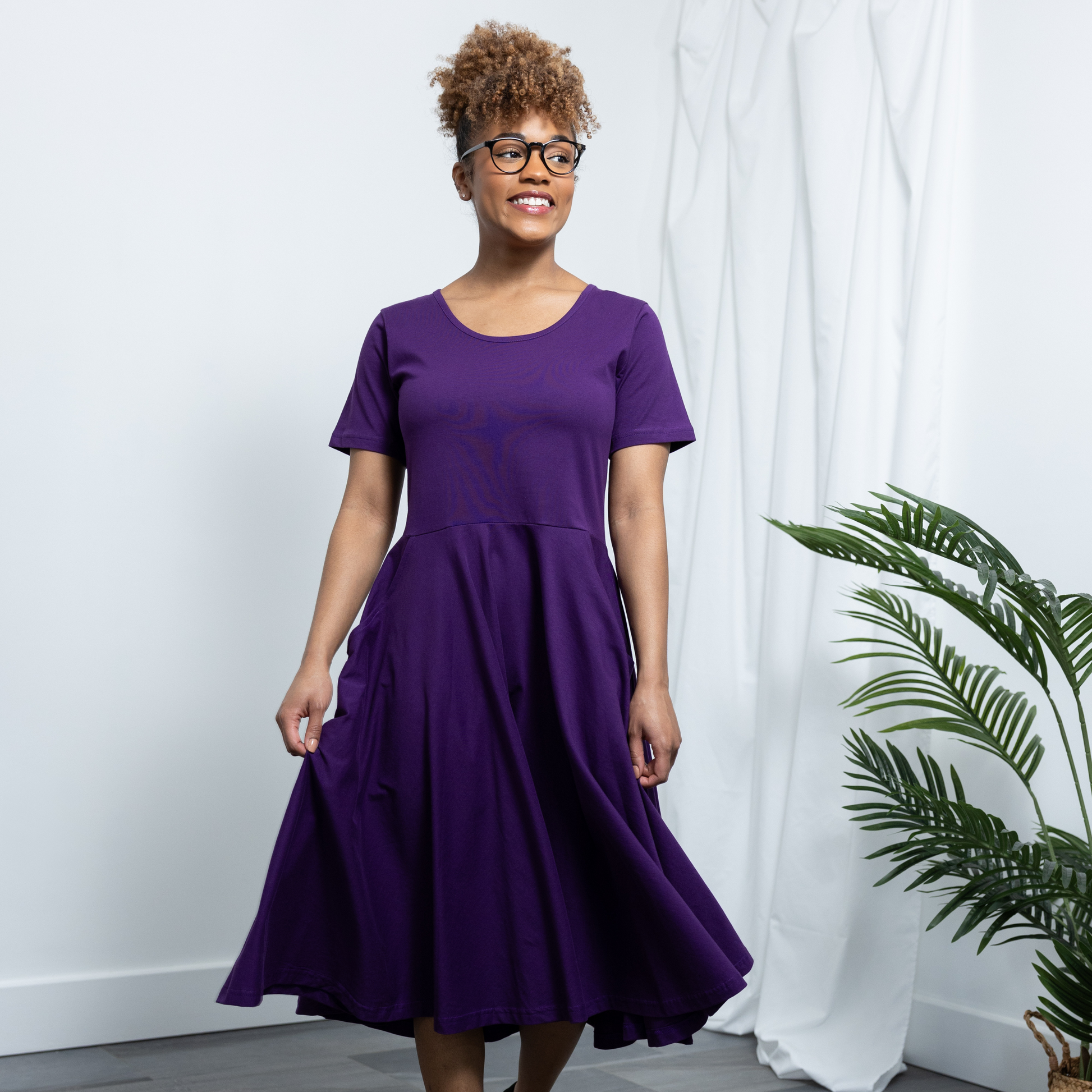 - Short sleeves, scoop neck full circle twirl adult dress with pockets