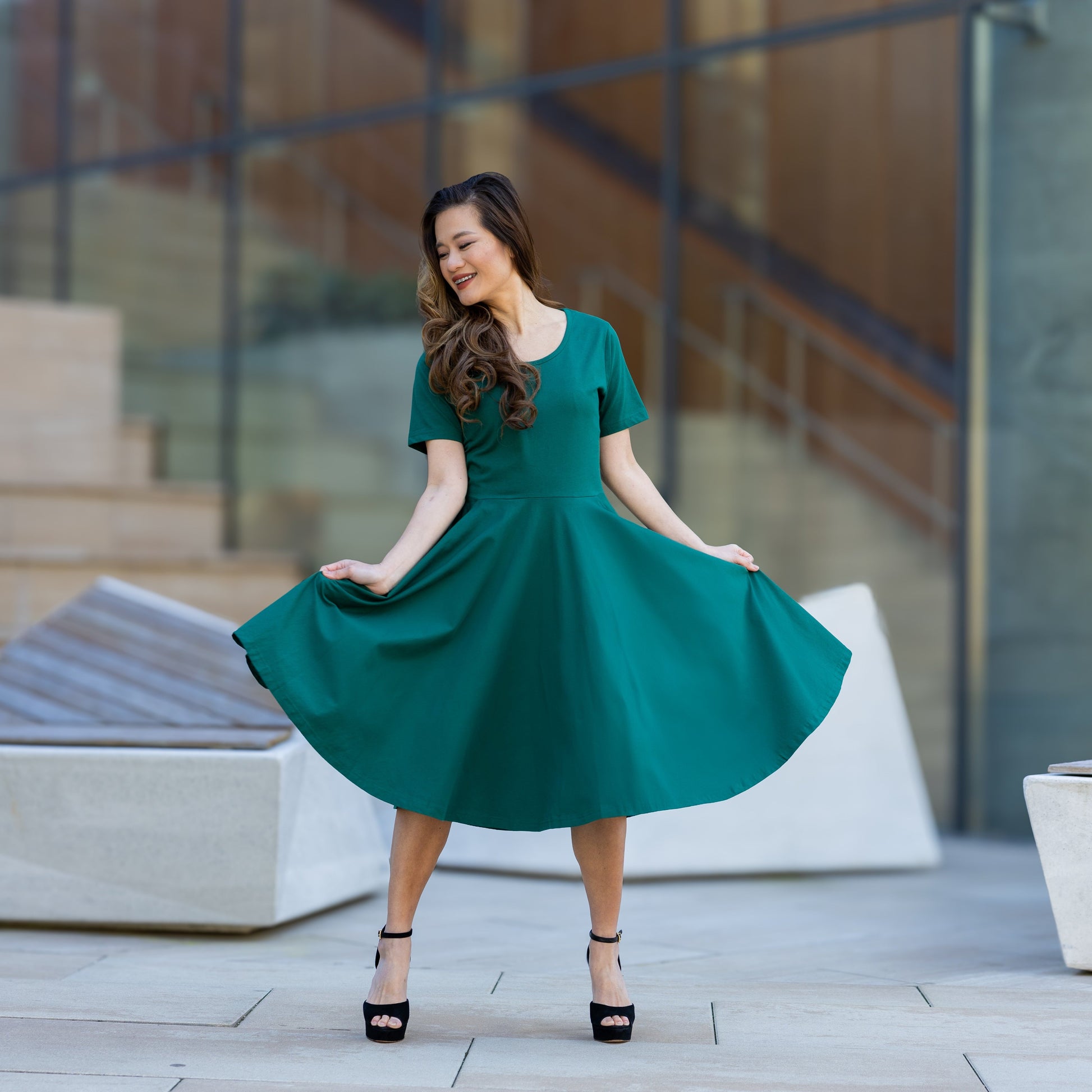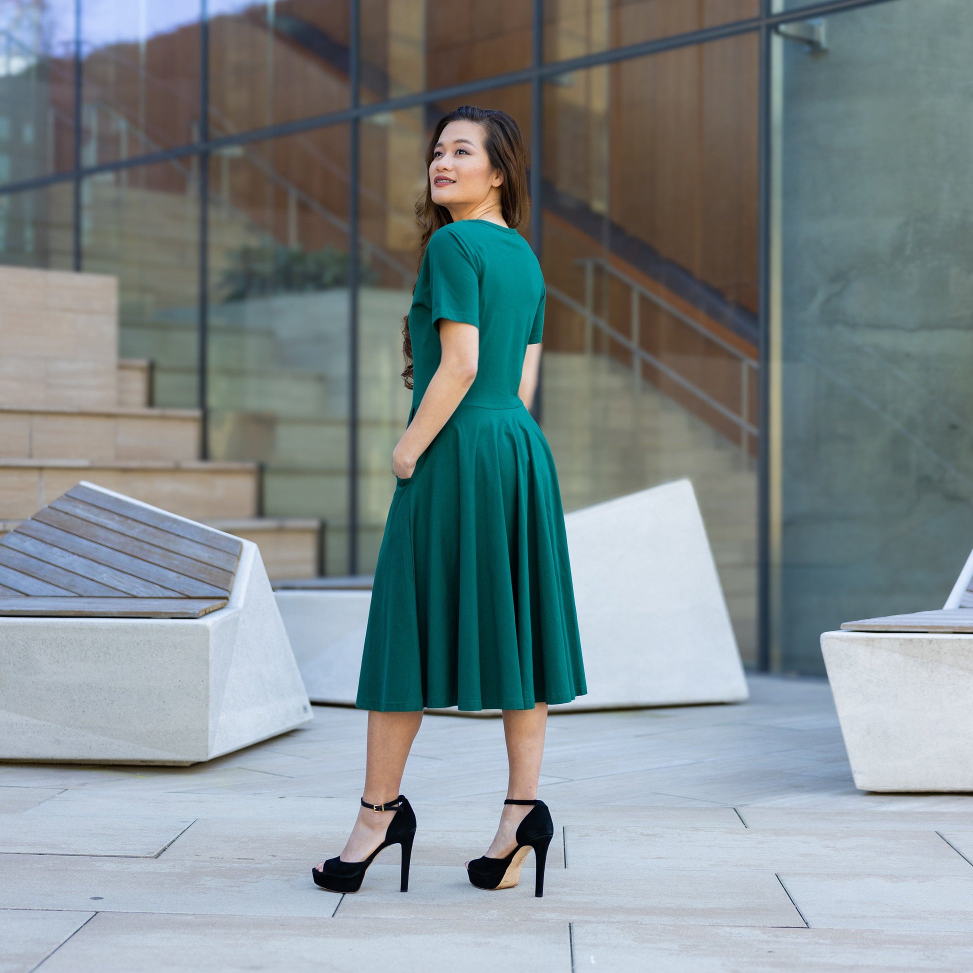 - Short sleeves, scoop neck full circle twirl adult dress with pockets