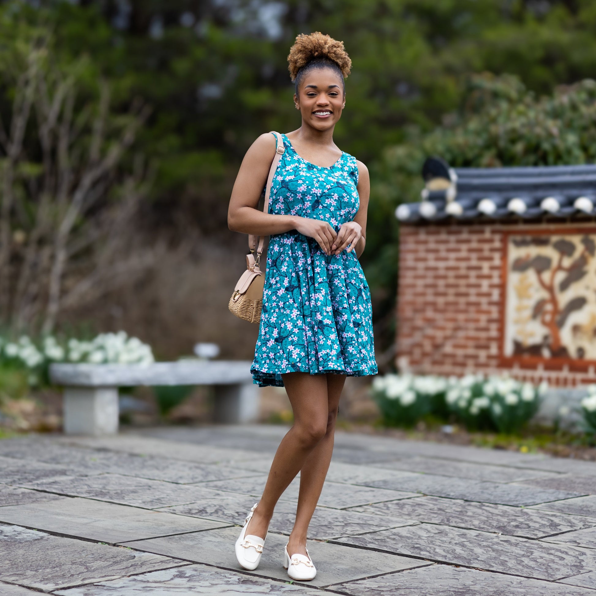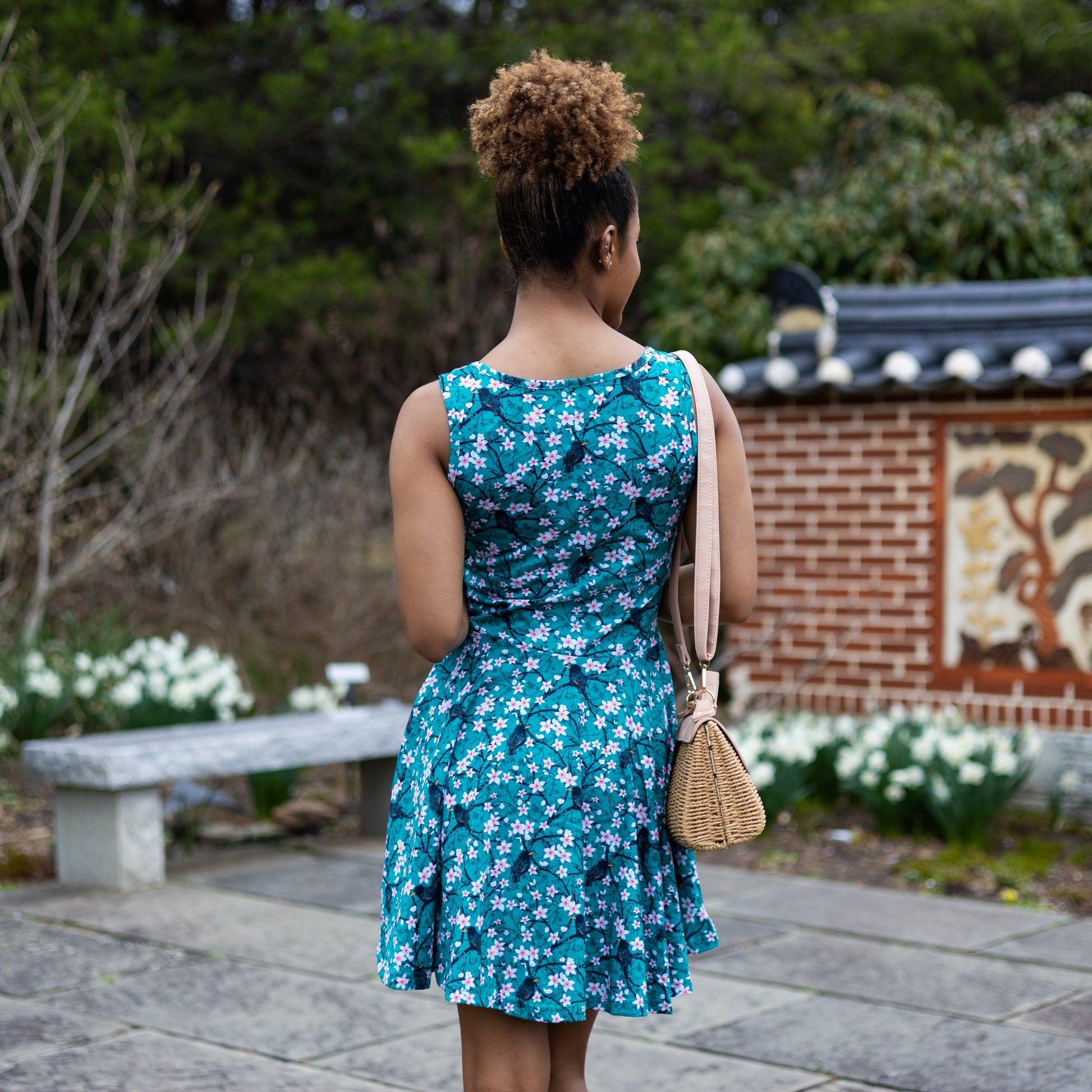 - Color: Teal with pink and white cherry blossoms and brown starlings design