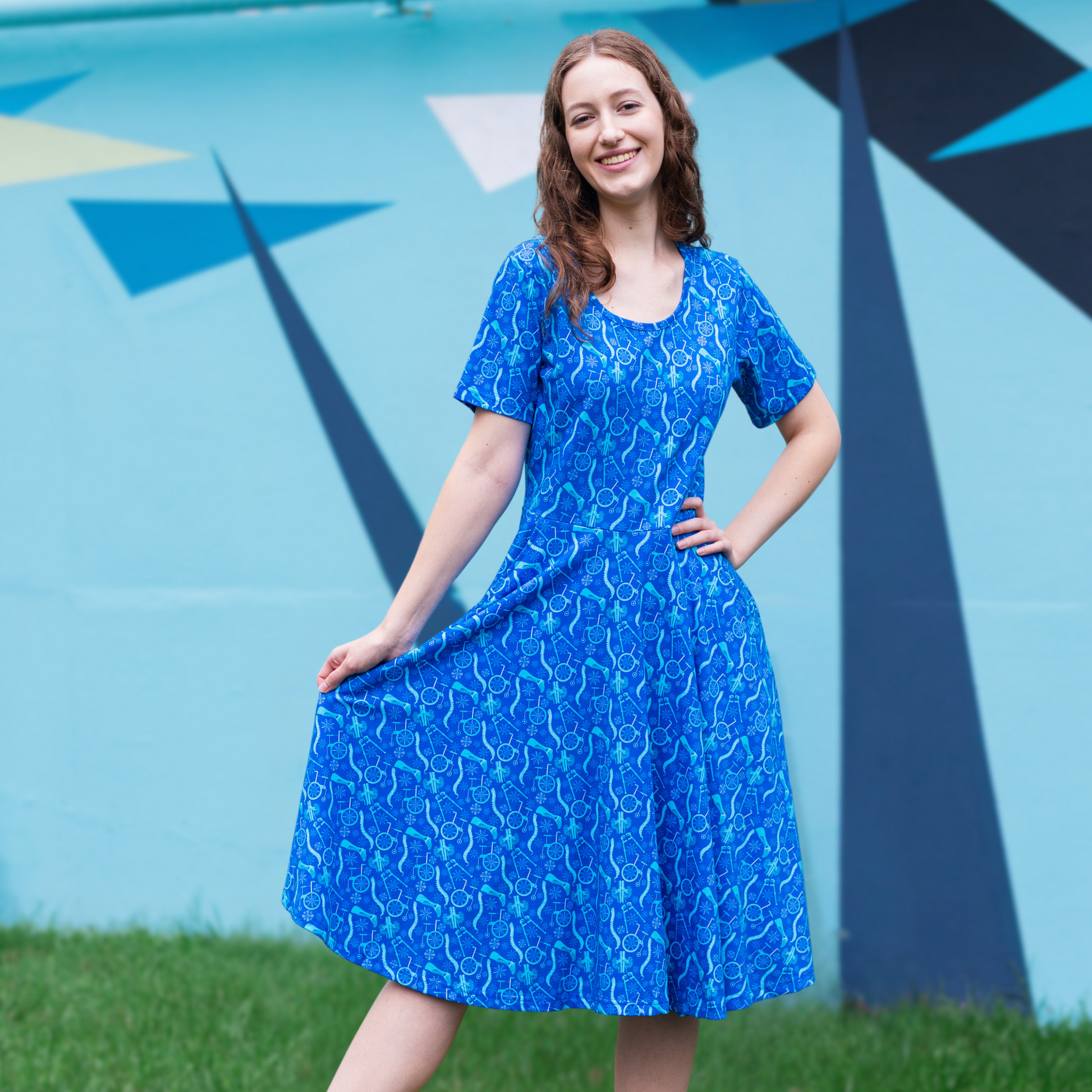 - Short-sleeve, scoop neck, 3/4th circle twirl adult dress with pockets