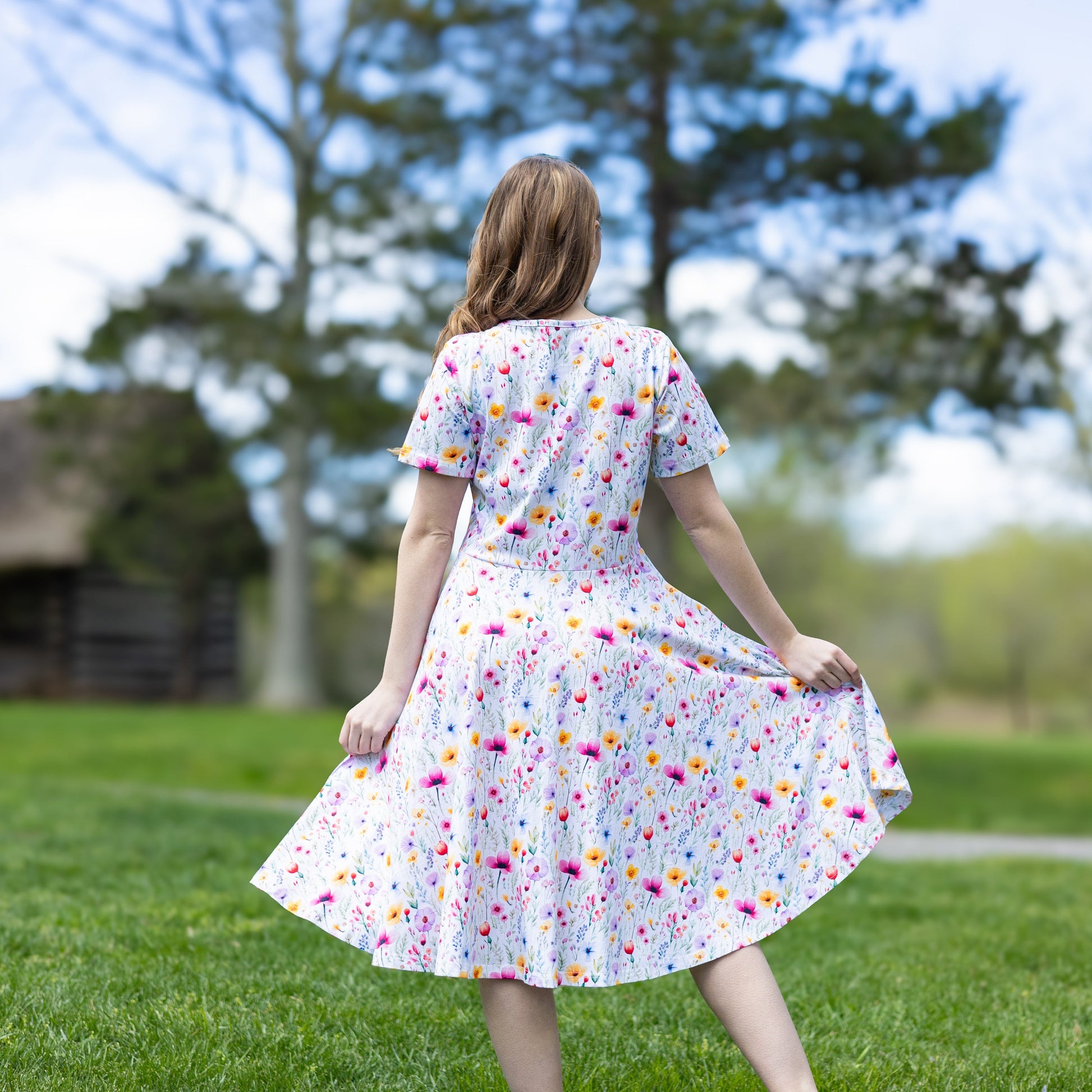 - Short sleeves, scoop neck, 3/4th circle twirl adult dress with pockets